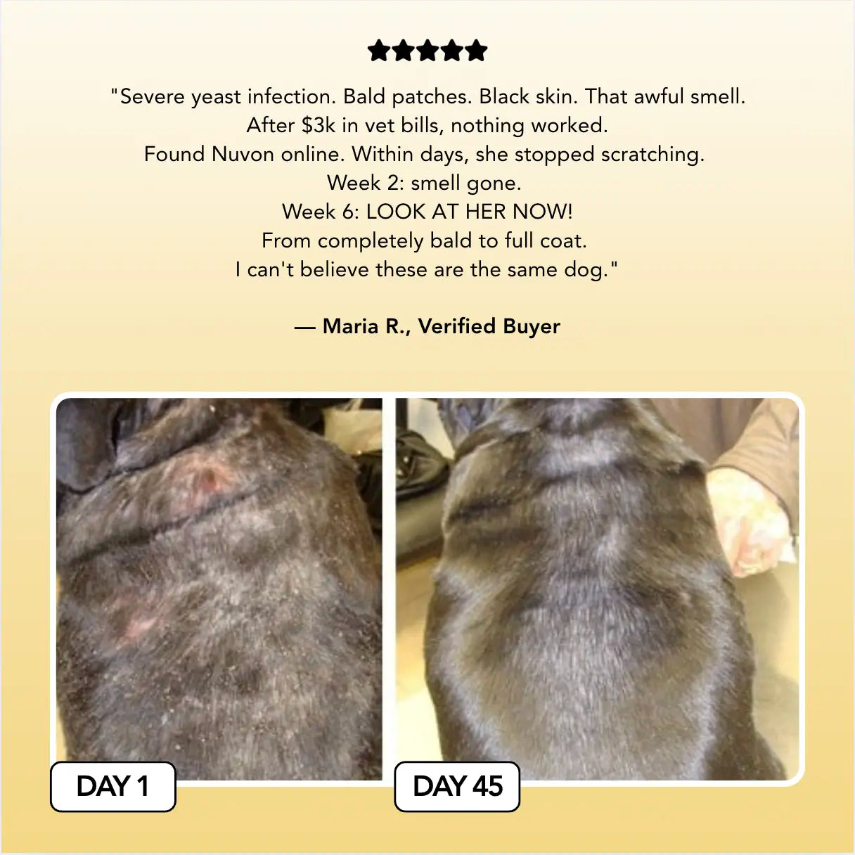 If Nuvon doesn't transform your dog's skin in 60 days, you pay nothing. Simple as that. No questions. No hassles. Just a full refund because we know it works.